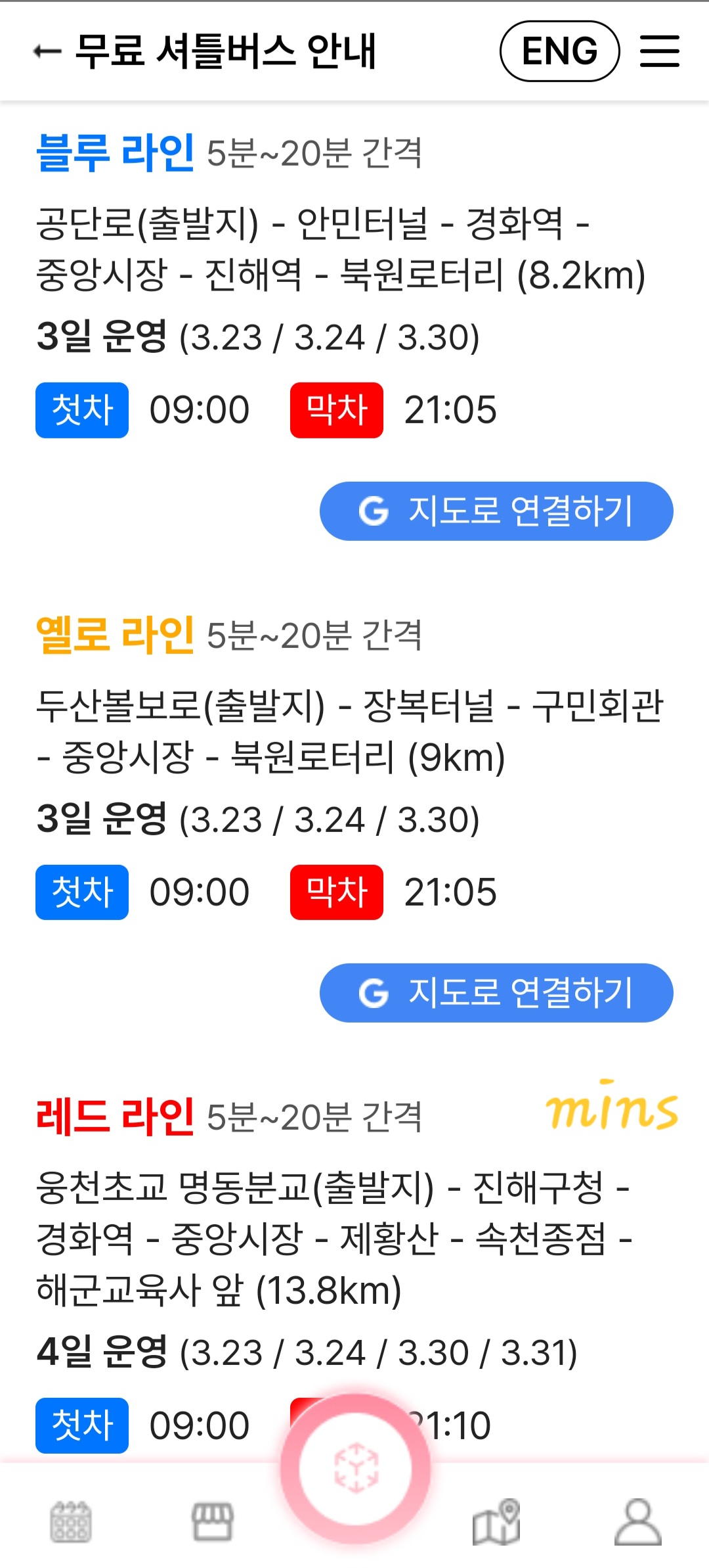 셔틀버스는 평일에 운영되는 순환노선과 주말에 운영하는 블루라인, 옐로라인, 레드라인 3개의 노선정보에 대한 운행 노선과 배차간격 등 자세한 정보를 확인할 수 있습니다.